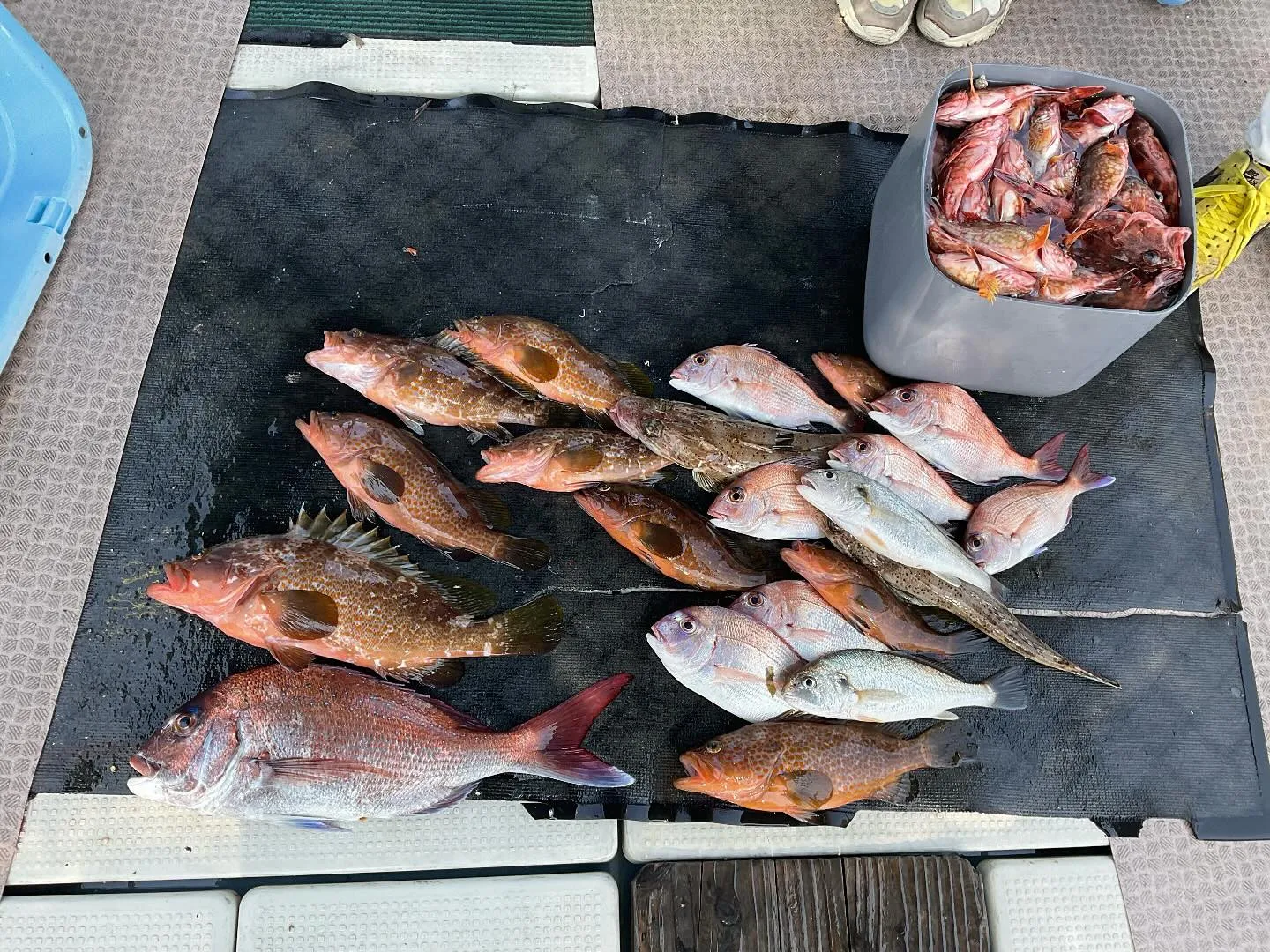 本日タイ釣りに出船したのですが、釣り始やや時化と思っていたらかなり時化てきたのでひと流しして内海入ろうとした途端に50cmオーバーを頭に立て続け4〜5枚釣れ内海に避難して釣っていたらまたも今度はアコウの連続で50cmないくらい〜を6〜7匹後はコチ・グチ・カサゴ等釣られてました😁カサゴ・ベラ等は各々のクーラーバケツいっぱいずつ位釣られてました😃時化・船酔いの中よく頑張られました。お疲れ様でした😃